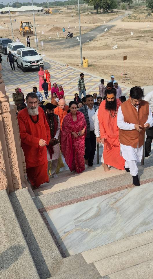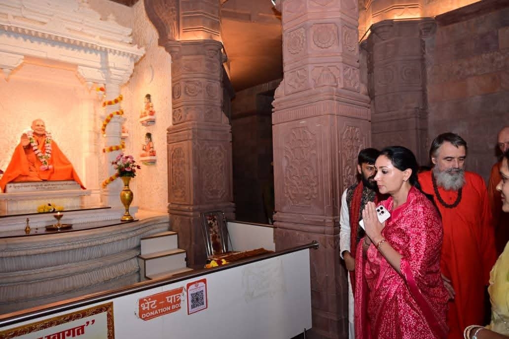 Diya Kumariji wrote about visit: "I felt supernatural peace and divine energy by visiting Om Ashram located in Pali. It was very pleasant and inspiring to receive the blessings of Vishwaguru Mahamandaleshwar Swami Maheshwaranand Ji Maharaj on this auspicious occasion. Spiritual atmosphere, Vedic sounds and sacred tradition of meditation filled the mind with amazing peace."